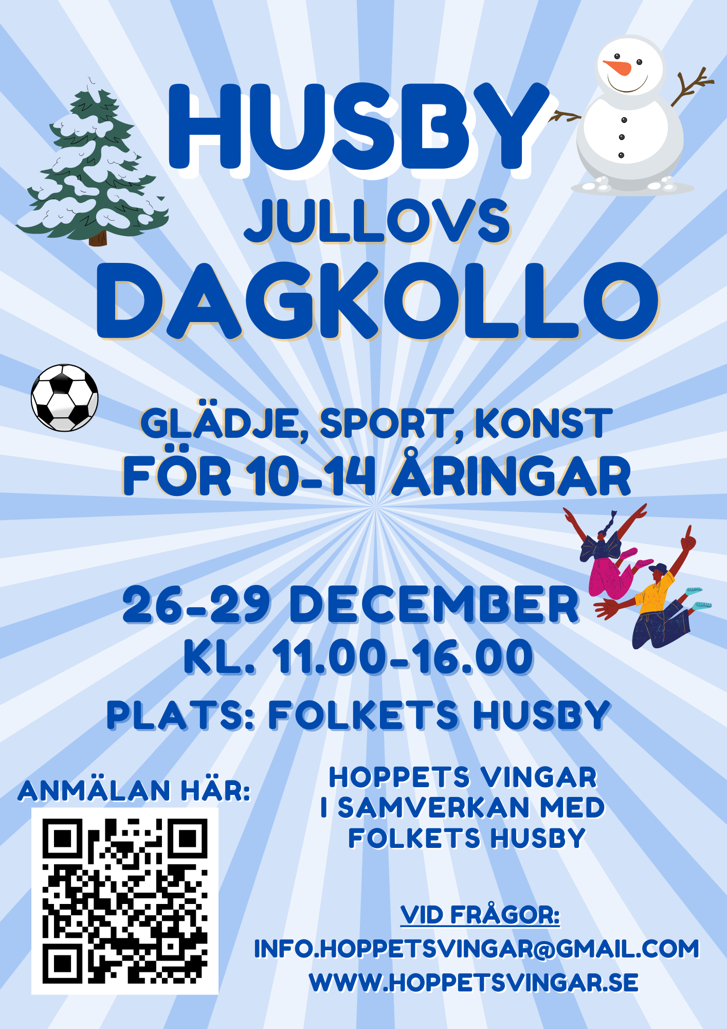 Är du mellan 11 och 14 år? Då är du varmt välkommen till Hoppets Vingars höstkollo i Husby den 27-31 oktober! Meningsfulla aktiviteter för hjärta och själ. Det blir mycket konst, sport och glädje! Tid: 11.00-16.00 Plats: Folkets Husby